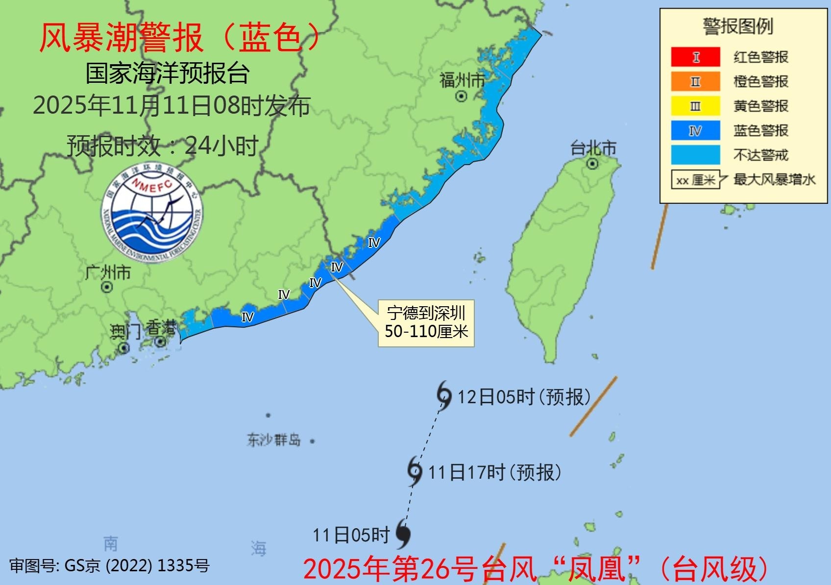 预计11月11日上午至12日上午,福建宁德到广东深圳沿海将出现50到110厘米的风暴增水。福建省漳州市,广东省潮州市、汕头市、揭阳市和汕尾市的风暴潮预警级别为蓝色。请沿海政府及相关部门按照职责做好防御风暴潮的应急准备工作;各涉海相关生产单位采取积极有效的措施,组织渔船、养殖渔排、养殖场等做好防御工作;加固沿海渔业养殖水产设施和渔港设施,做好防潮准备。