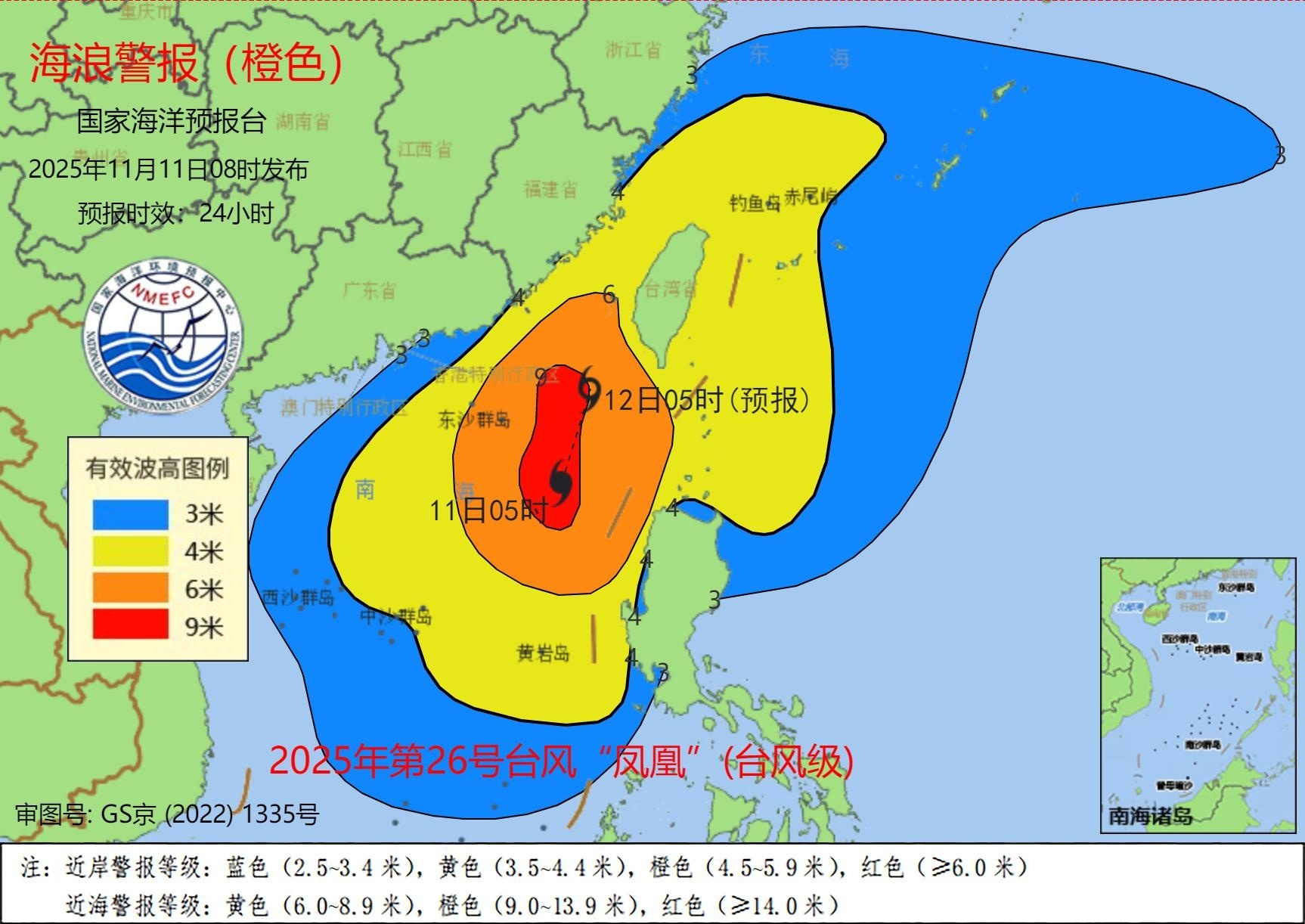 11月11日,国家海洋预报台发布海浪橙色警报、风暴潮蓝色警报。受今年第26号台风“凤凰”(台风级)和冷空气的共同影响股点网,预计11月11日上午到12日上午股点网,南海北部、中部将出现7到10米的狂浪到狂涛区,台湾海峡将出现4到6米的巨浪到狂浪区,东海南部将出现3到5米的大浪到巨浪区,近海海域海浪预警级别为橙色;福建南部近岸海域将出现3到5米的大浪到巨浪,该近岸海域海浪预警级别为橙色,福建北部、广东东部近岸海域将出现3到4米的大浪到巨浪,该近岸海域海浪预警级别为黄色,浙江南部近岸海域将出现2到3.4米的中浪到大浪,该近岸海域海浪预警级别为蓝色。请在上述海域作业的船只注意安全,沿海各有关单位提前采取防浪避浪措施。